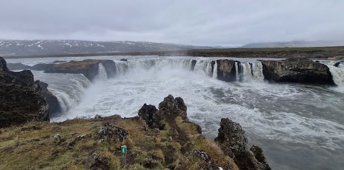 Our first major stop was the majestic Goðafoss, a cascading masterpiece of nature. Located right off the Ring Road, the parking area made it easy to access the falls with just a short walk. Legend has it that this is where Icelandic chieftain Þorgeir Ljósvetningagoði threw his pagan idols after converting to Christianity in the year 1000. Standing before its roaring waters, we couldn’t help but feel the divine energy that inspired such stories. The surrounding paths offered excellent views, perfect for photography and contemplation.