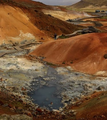 Our adventure began at the Seltún geothermal area near Krýsuvík, where the landscape was a mesmerizing display of nature's colors. Surrounded by the surreal hues of yellows, reds, and browns, I marveled at the steam vents and boiling mud pools that rose ominously from the earth. The air was thick with the pungent scent of sulfur, filling my lungs with an unmistakable reminder of the geothermal activity beneath my feet.
