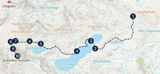 Beautiful Lakes: The trail passes several stunning lakes, such as Llyn Llydaw and Llyn Teyrn, offering perfect spots to rest and admire the scenery.